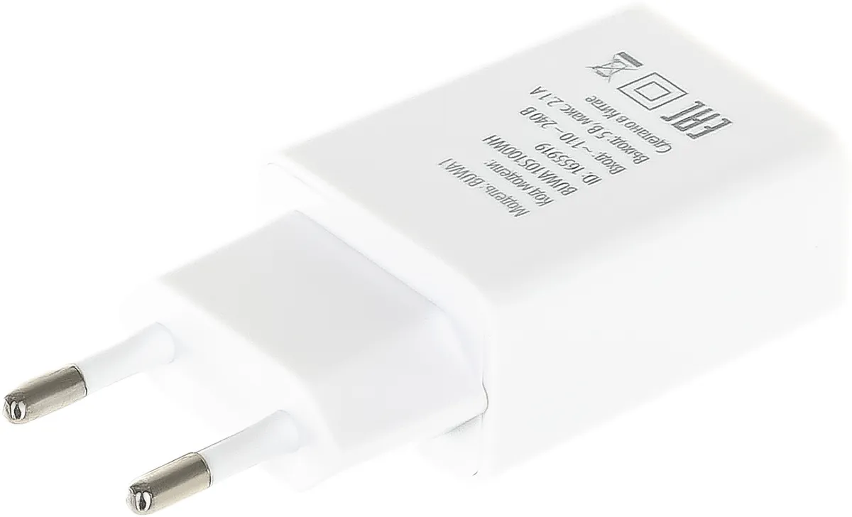 Универсальное сетевое зарядное устройство с выходом USB-A с максимальной силой тока 2.1 А, позволяющее заряжать мобильные устройства разных производителей. -