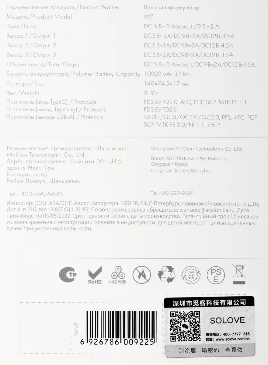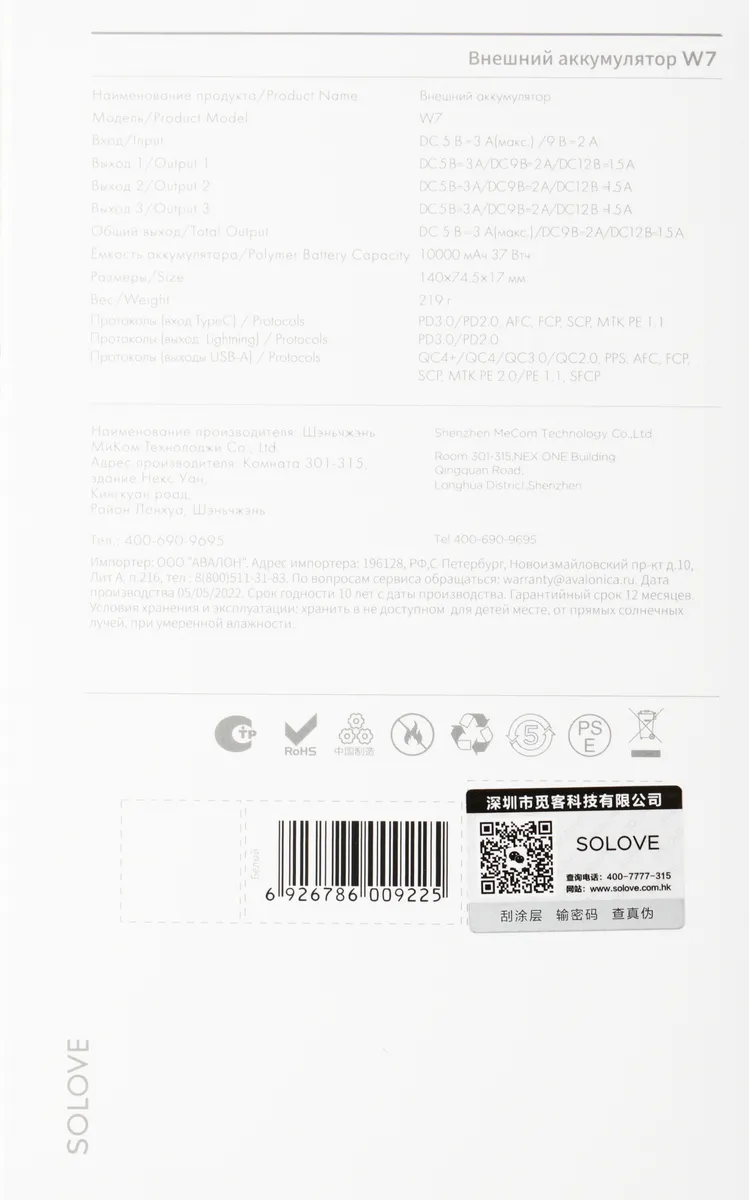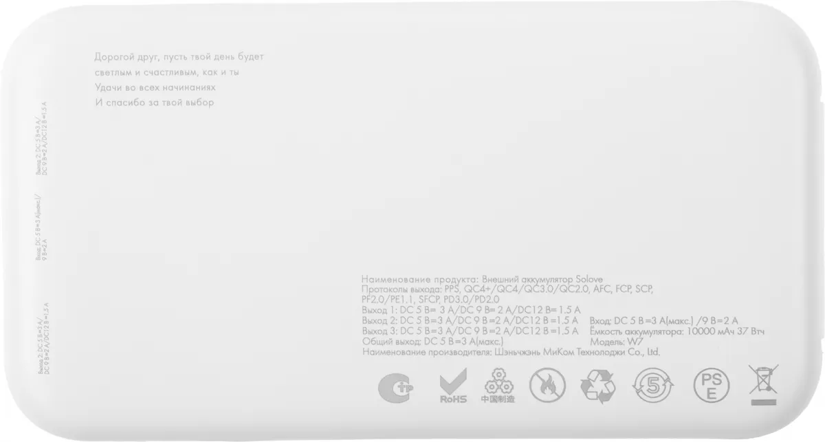 Мобильный аккумулятор Solove Solove W7 10000mAh QC3.0 3A белый (W7 WHITE RUS) (W7 WHITE RUS)