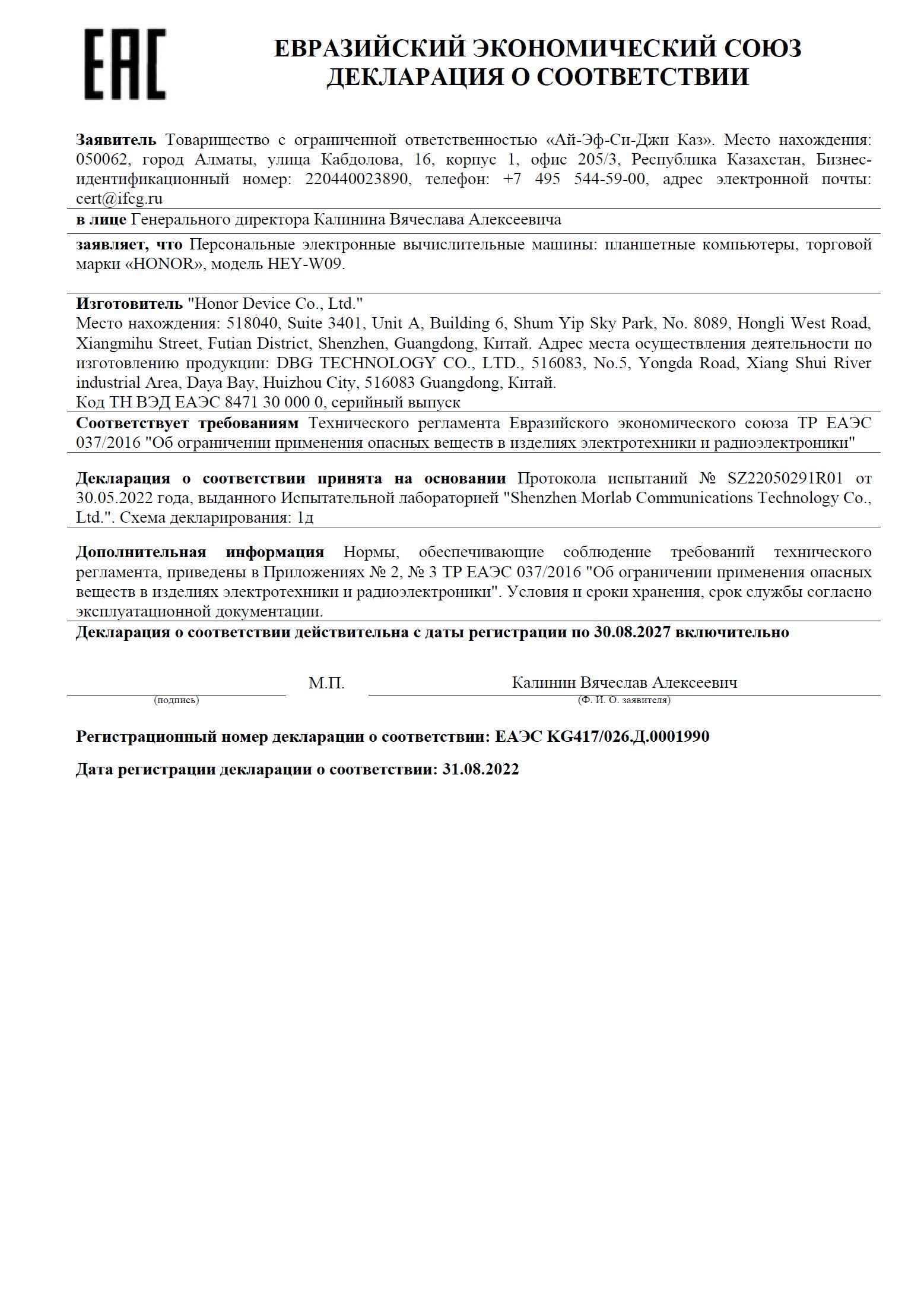 ЕАЭСД KG CN Д.KG417/026.Д.0001990 | 30.08.2022 | 29.08.2027 |