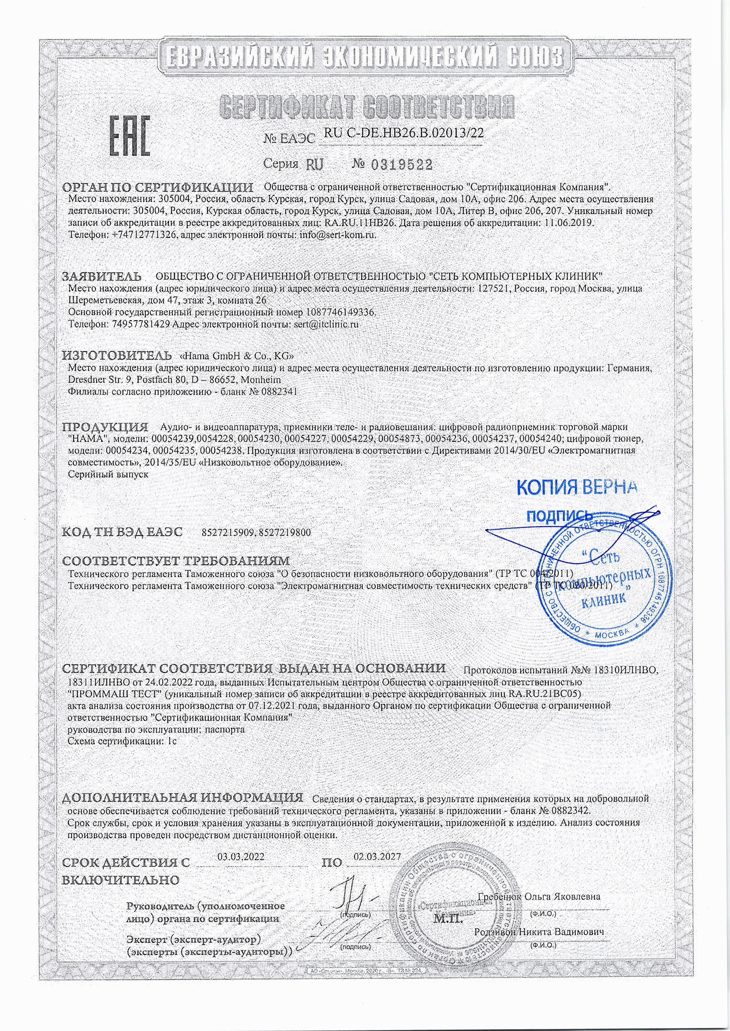 ЕАЭС RU С-DE.НВ26.В.02013/22 | 02.03.2022 | 01.03.2027 |