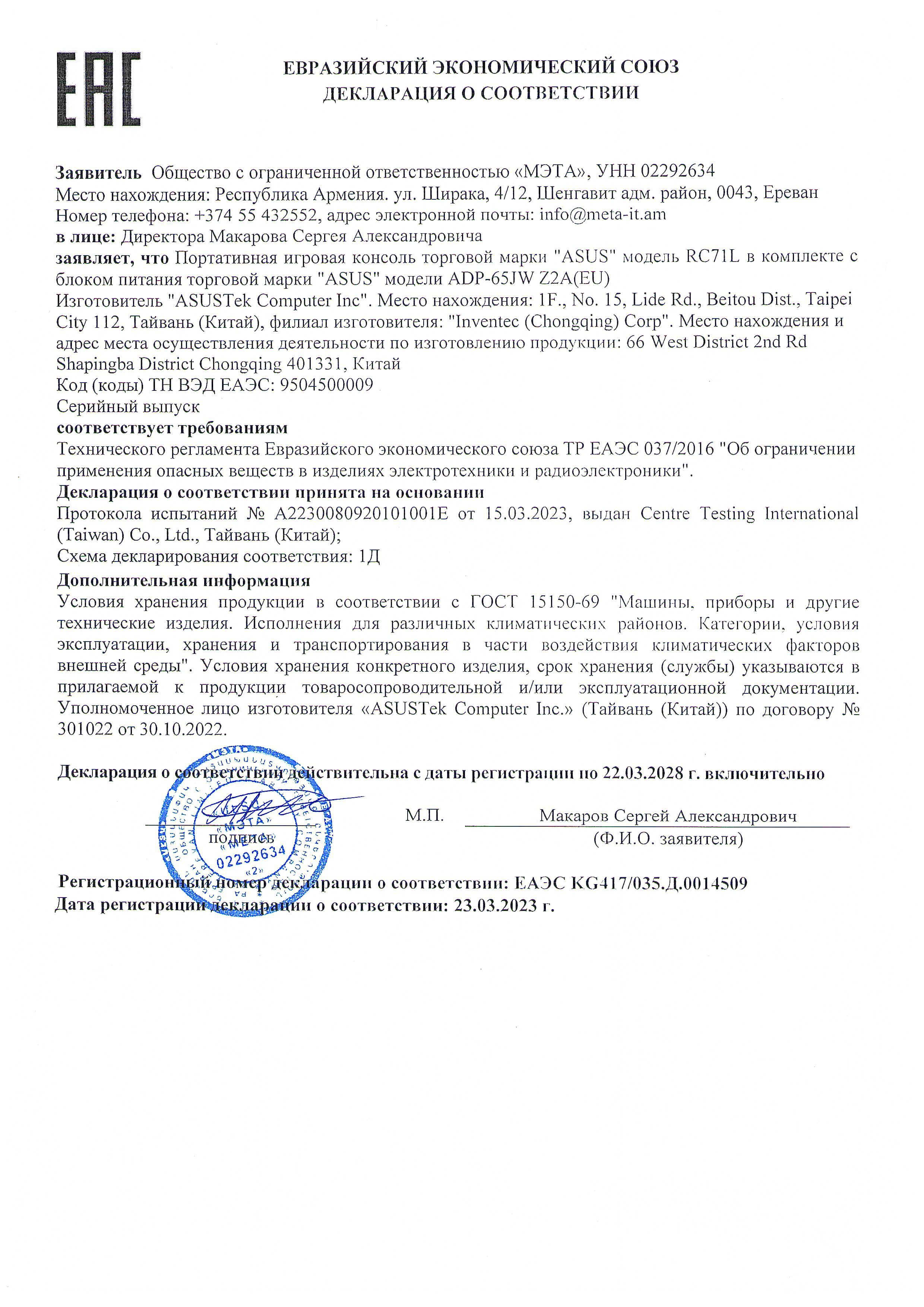 | Игровая консоль Asus ROG Ally белый | ЕАЭСД KG TW Д.417/035.Д.0014509 | 22.03.2023 | 21.03.2028 |