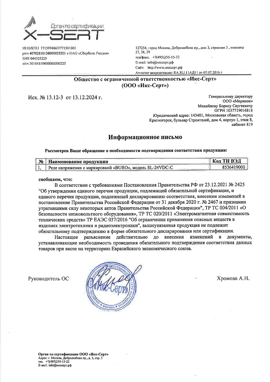 | Реле напряжения Buro SL-24VDC-C | ОТКАЗ_ТРТС RU ..ОТКАЗНОЕ | 12.12.2024 | 11.12.2025 |