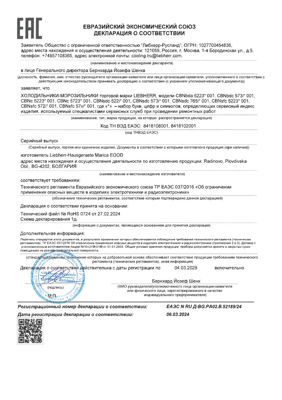 | Холодильник Liebherr CBNc 5723 2-хкамерн. белый | ЕАЭС N RU Д-BG.РА02.В.52189/24 | 05.03.2024 | 03.03.2029 |