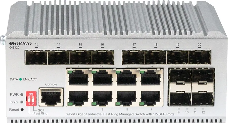 Коммутатор ORIGO Managed L2 Industrial Fast Ring Switch 8x1000Base-T, 12x1000Base-X SFP, Surge (OI3120/A1A)