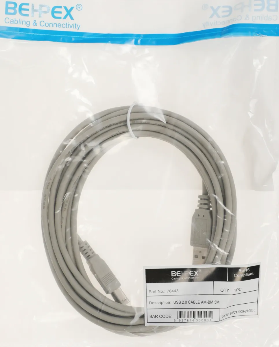 Кабель для подключения оргтехники, источников бесперебойного питания и прочих устройств с портом USB type-B к персональным компьютерам и ноутбукам. Длина кабеля в 5 метров, позволяет разместить подключаемое устройство максимально удобном расстоянии. -