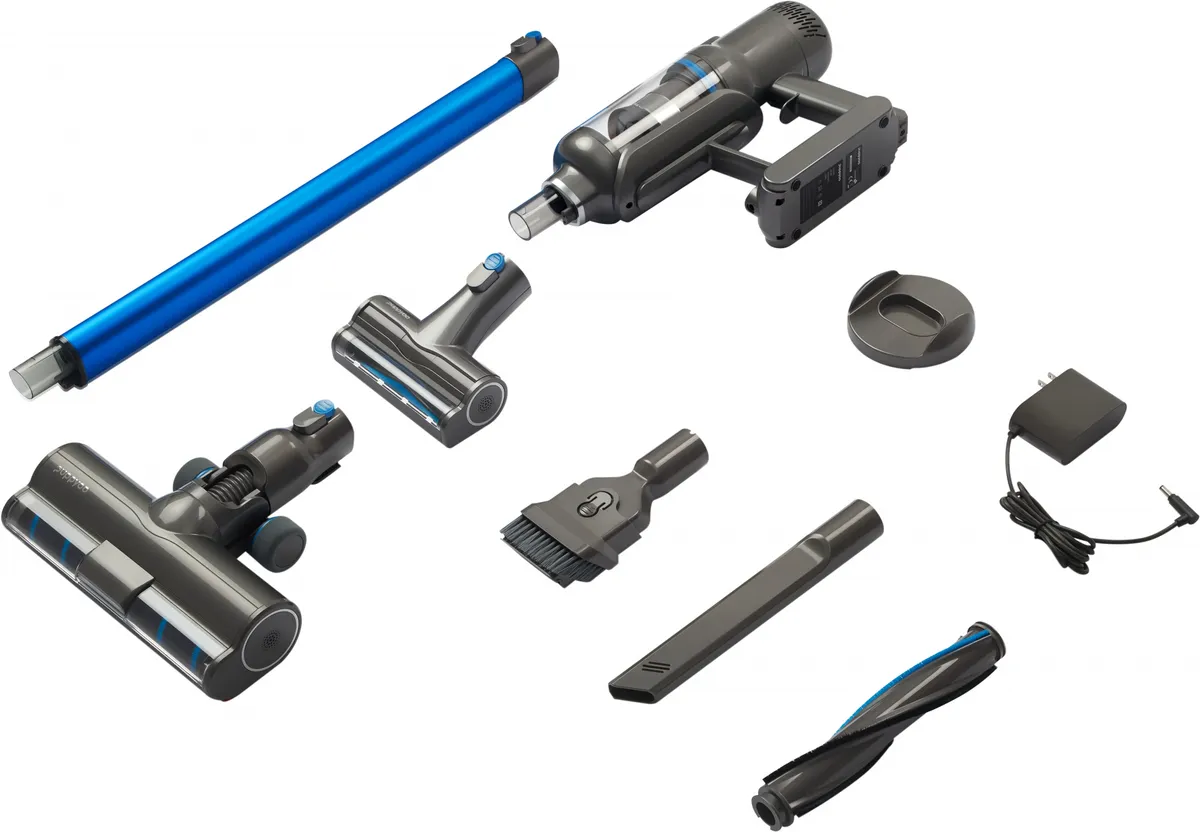 Стильный дизайн с LED - подсветкой. Время автономной работы аккумулятора 60 минут, а время полного заряда от сети 3,5 часа. В комплекте есть крепление – хранение и зарядка 2 в 1. Технология множественных циклонов создает усиленное всасывание, что гарантир -