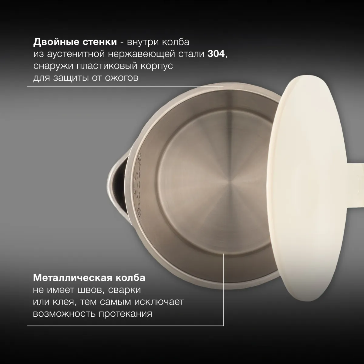 Двойной теплоизолированный корпус. Внешний корпус из термостойкого пластика, защищает от случайного ожога при прикосновении. Внутренний бесшовный корпус исключает протекание , выполнен из аустенитно стали 304, не впитывает и не выделяет примесей, устойчив -