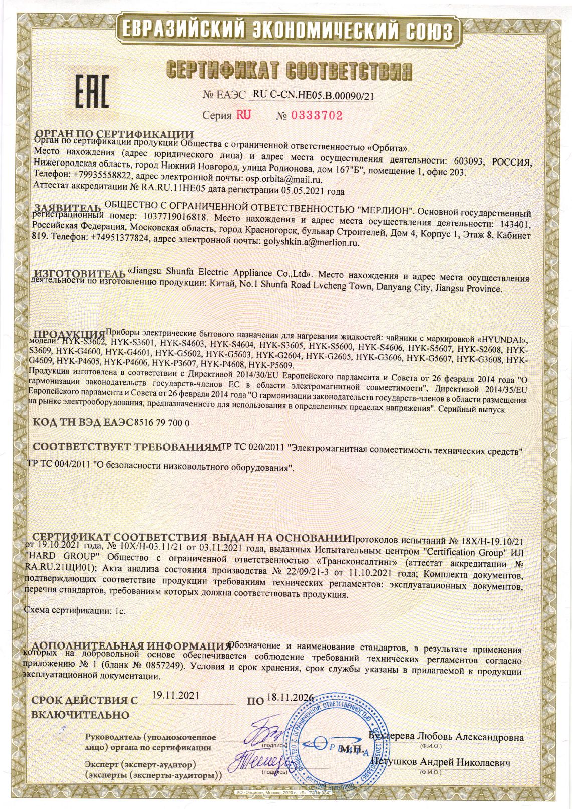 | Чайник электрический Hyundai HYK-S3605 1.7л. 2200Вт кремовый корпус: металл | ЕАЭС RU С-CN.НЕ05.В.00090/21 | 18.11.2021 | 17.11.2026 |