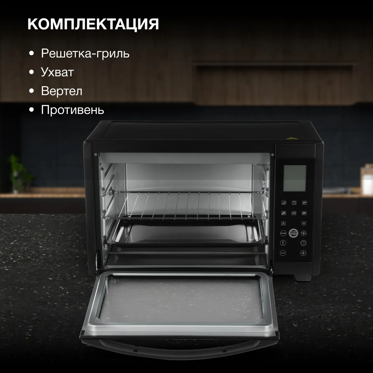 поддон для сбора крошек и масла, вертел, ручка для снятия вертела, противень, ухват для снятия противня, хромированная решетка гриль -