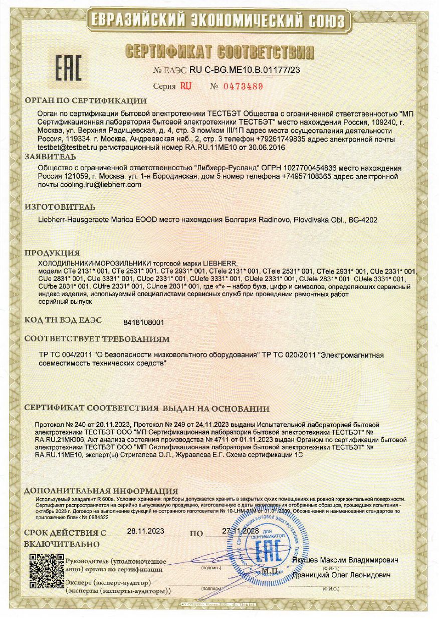 | Холодильник Liebherr CTele 2931 2-хкамерн. серебристый | ЕАЭС RU С-BG.МЕ10.В.01177/23 | 27.11.2023 | 26.11.2028 |