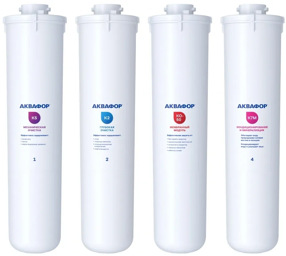 В комплект входят четыре модуля: K5 Предварительная очистка, К2 Глубокая фильтрация, К7M постфильтрация и минерализация, мембранный модуль КО-50 обратноосмотическая мембрана. -