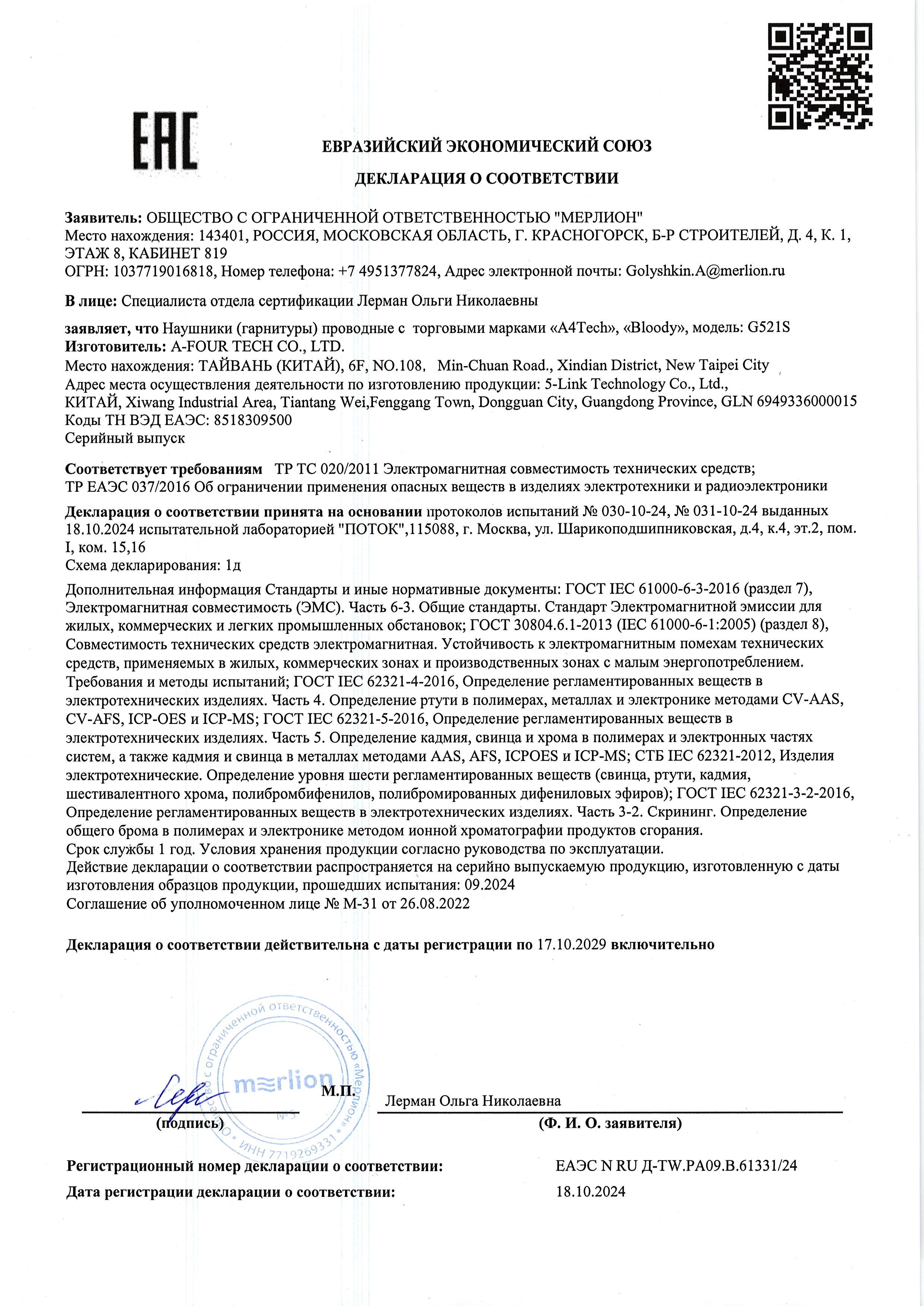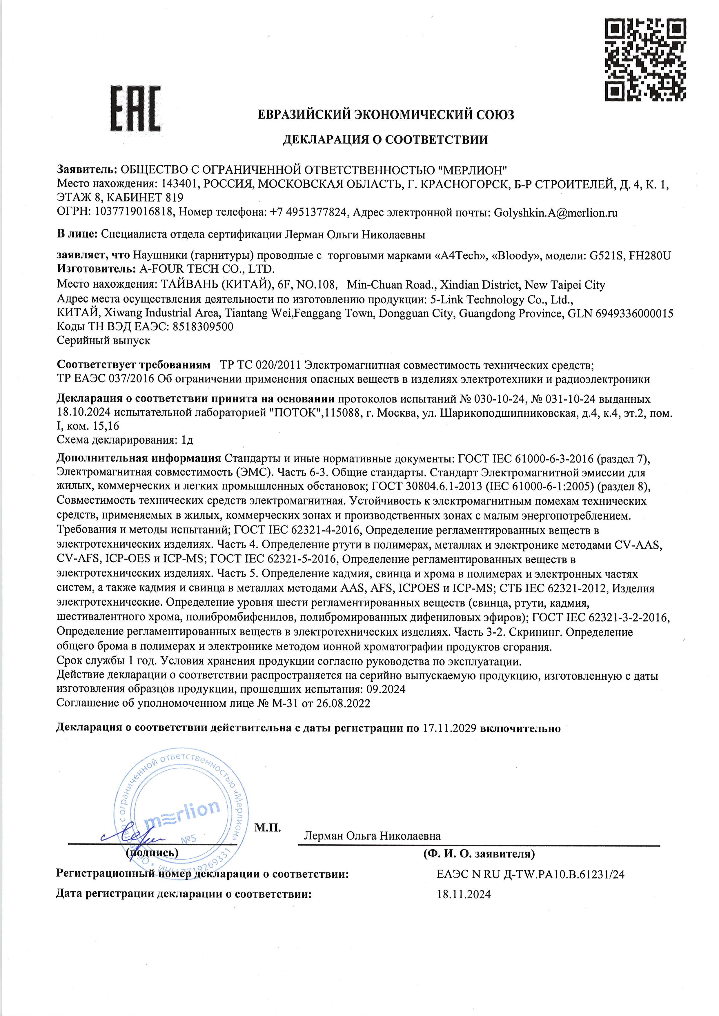Наушники с микрофоном A4Tech Bloody G521S серый 2.3м мониторные USB оголовье (G521S) | ЕАЭС N RU Д-TW.РА10.В.61231/24 | 17.11.2024 | 16.11.2029 |
