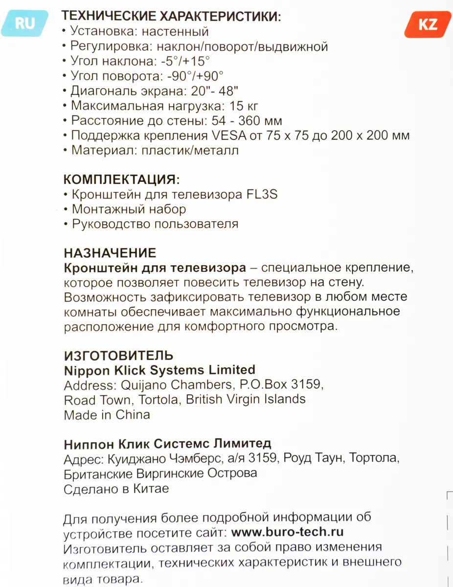 Кронштейн для телевизора Buro FL3S черный 20"-48" макс.15кг (BM15A72TS3)