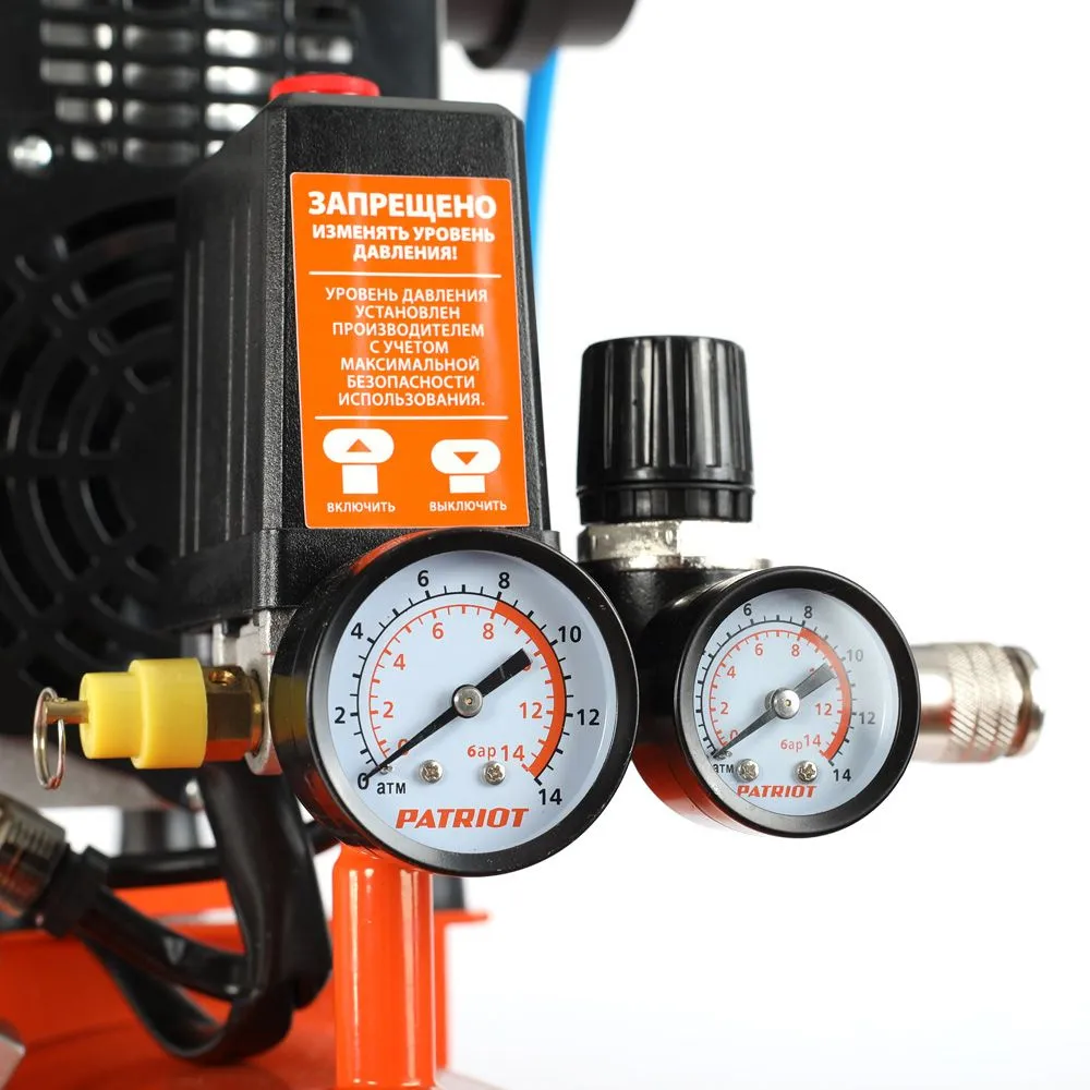 Двигатель оснащен термопредохранителем. Можно транспортировать в горизонтальном положении. Быстросъемный штуцер для удобства. Регулировка и контроль давления в ресивере и на выходе при помощи двух манометров. Тефлоновые кольца на поршне с низким коэффицие -