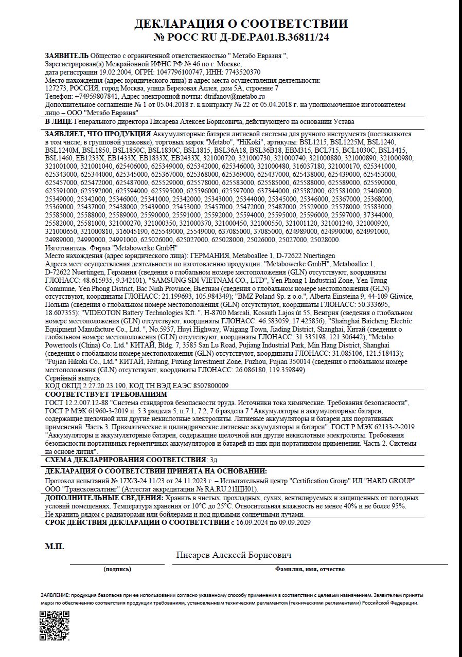 Батарея аккумуляторная Metabo LI-Power 18В 5.2Ач Li-Ion (625028000) | Д RU DE.РА01.В.36811/24 | 15.09.2024 | 08.09.2029 |