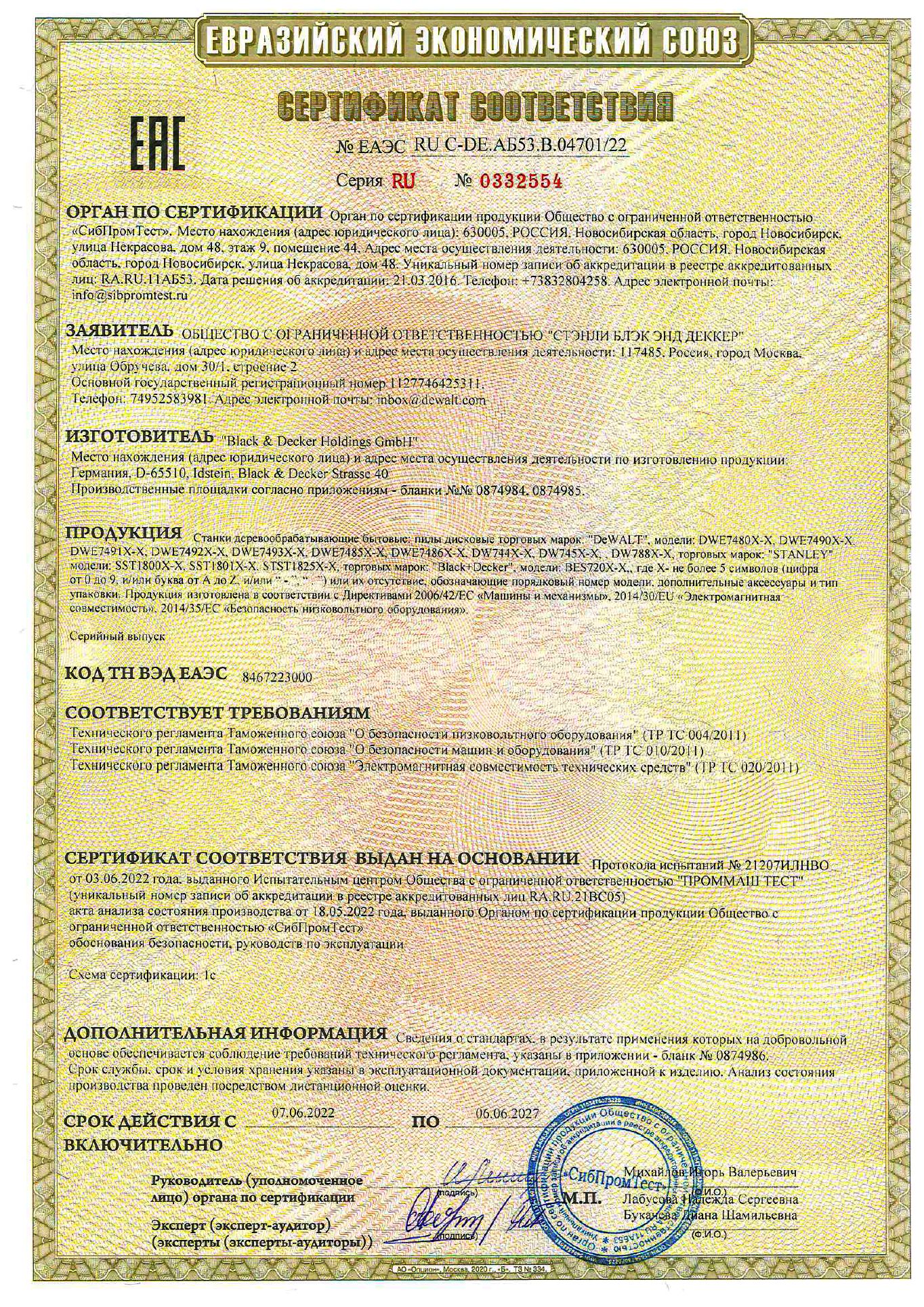 | Циркулярная пила (дисковая) DeWalt DWE7492 2000Вт (настольная) D диска.:250мм (DWE7492-QS) | ЕАЭС RU С-DE.АБ53.В.04701/22 | 06.06.2022 | 05.06.2027 |