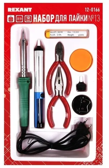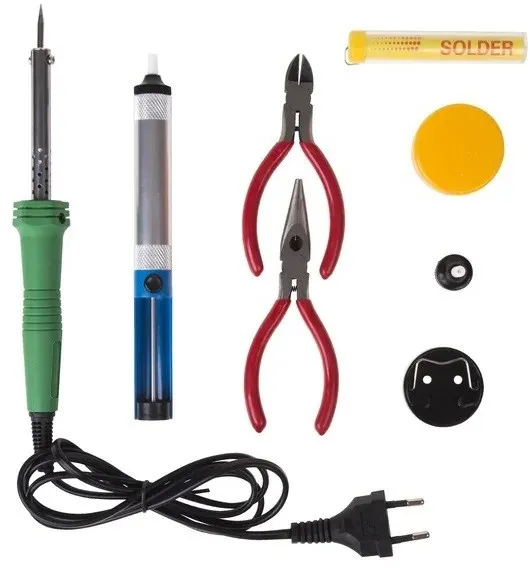 Паяльник 30 Вт (230 V, 50Hz); Подставка под паяльник; Металлический держатель паяльника с хромовым покрытием; Оловоотсос и дополнительный сменный наконечник для него; Канифоль; Припой спиралью в колбе, d=1 мм; Бокорезы с прорезиненными ручками; Тонкогубцы -
