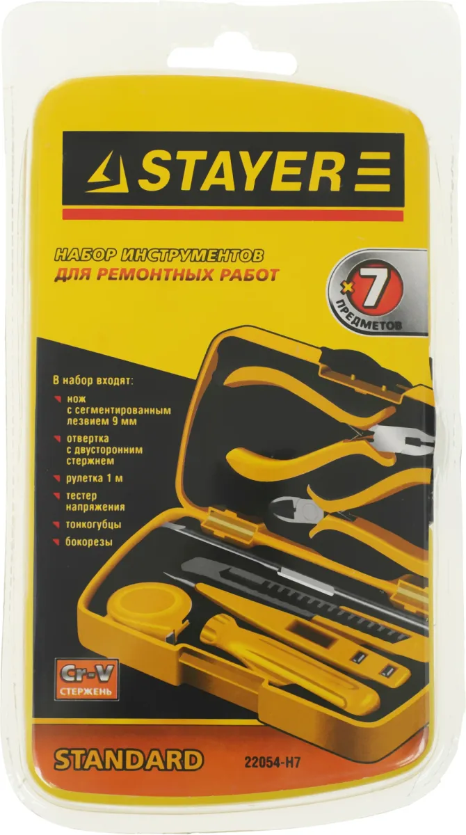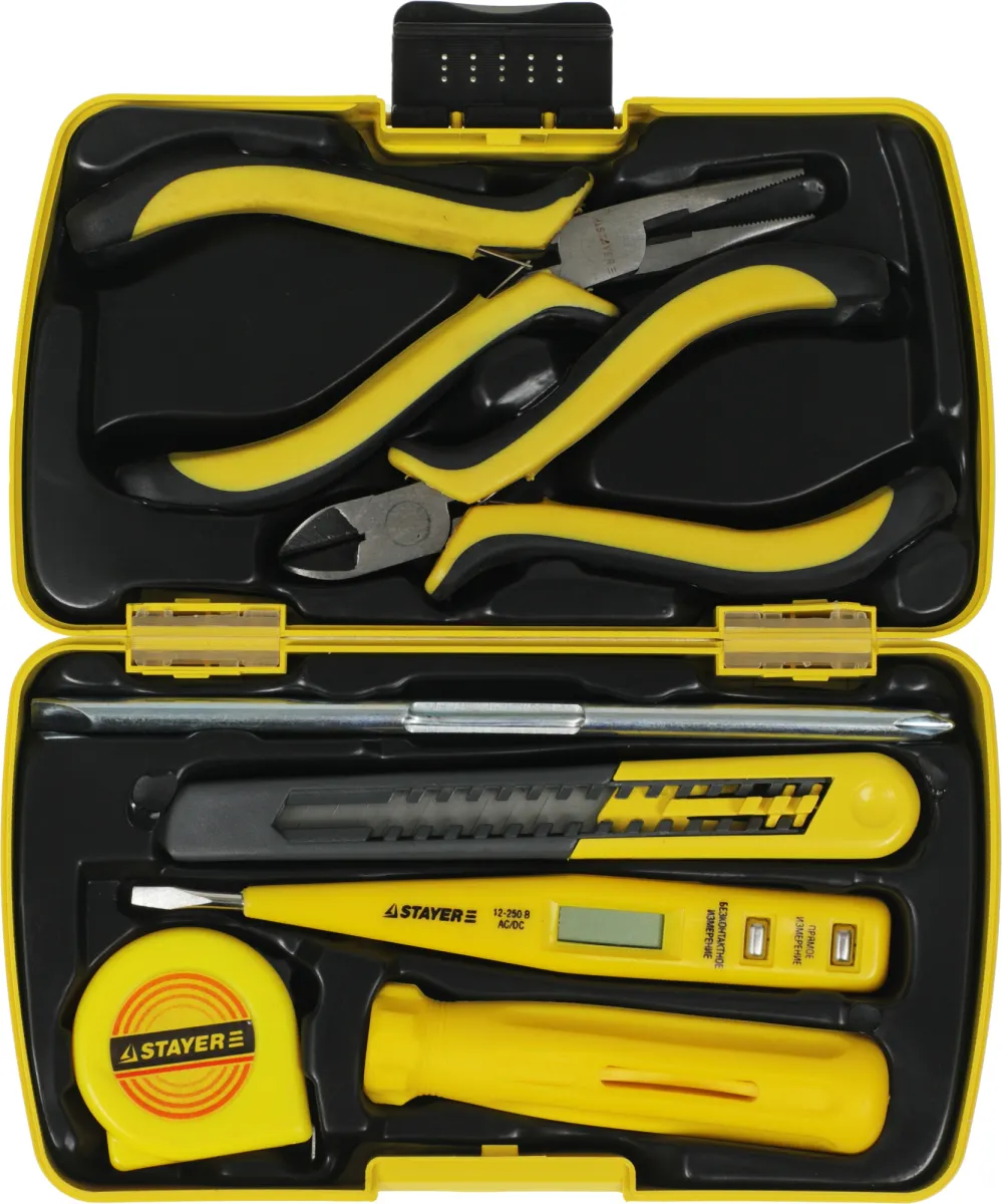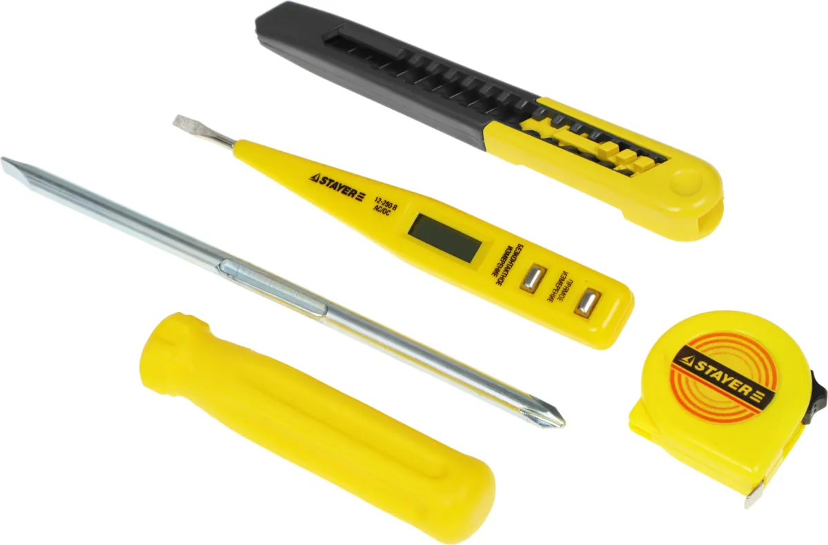 Нож с сегментированным лезвием (9 мм); отвертка с двусторонним стержнем; тестер напряжения; тонкогубцы. -