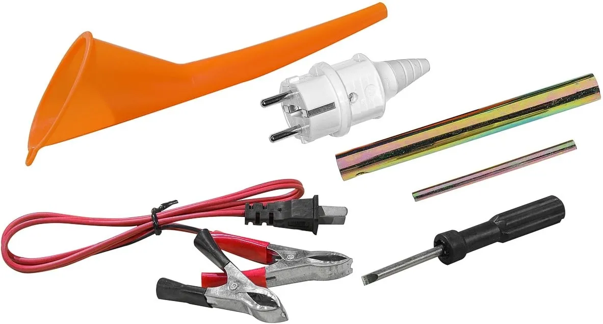Электрическая вилка, свечной ключ, отвертка, клемы, воронка. -