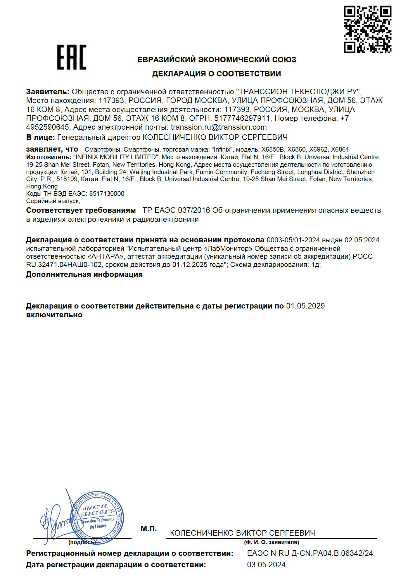 | Смартфон Infinix X6861 Zero 40 5G 512Gb 12Gb черный моноблок 3G 4G 6.78" Android 14 802.11 a/b/g/n/ac GPS GSM900/1800 GSM1900 TouchSc Protect | ЕАЭС N RU Д-CN.РА04.В.06342/24 | 02.05.2024 | 30.04.2029 |