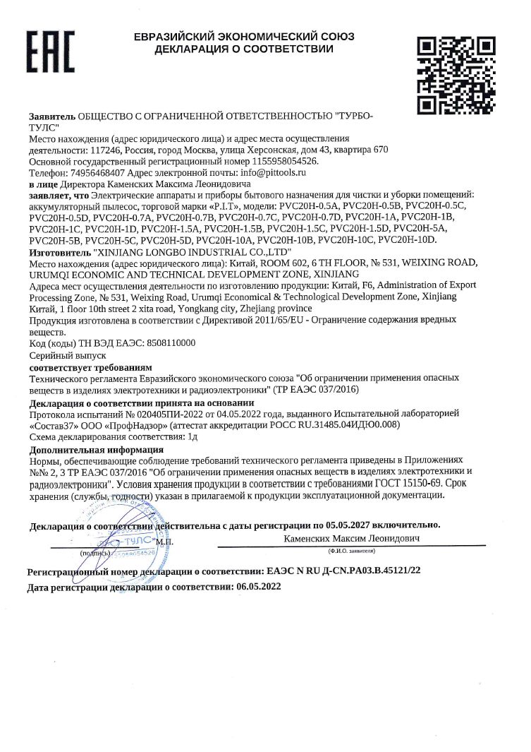 | Строительный пылесос P.I.T. PVC20H-0.5A Solo (уборка: сухая) черный | ЕАЭС N RU Д-CN.РА03.В.45121/22 | 05.05.2022 | 04.05.2027 |