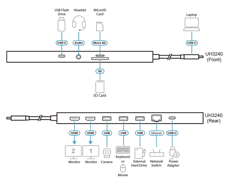 UH3240 многопортовая док-станция оснащена 11 основными портами для предоставления дополнительных возможностей расширения для HDMI, USB-C , USB Type-A, SD / MicroSD, Ethernet и аудиоустройств. Она поддерживает до 4K при 120 Гц для одного видеовыхода 1 или -