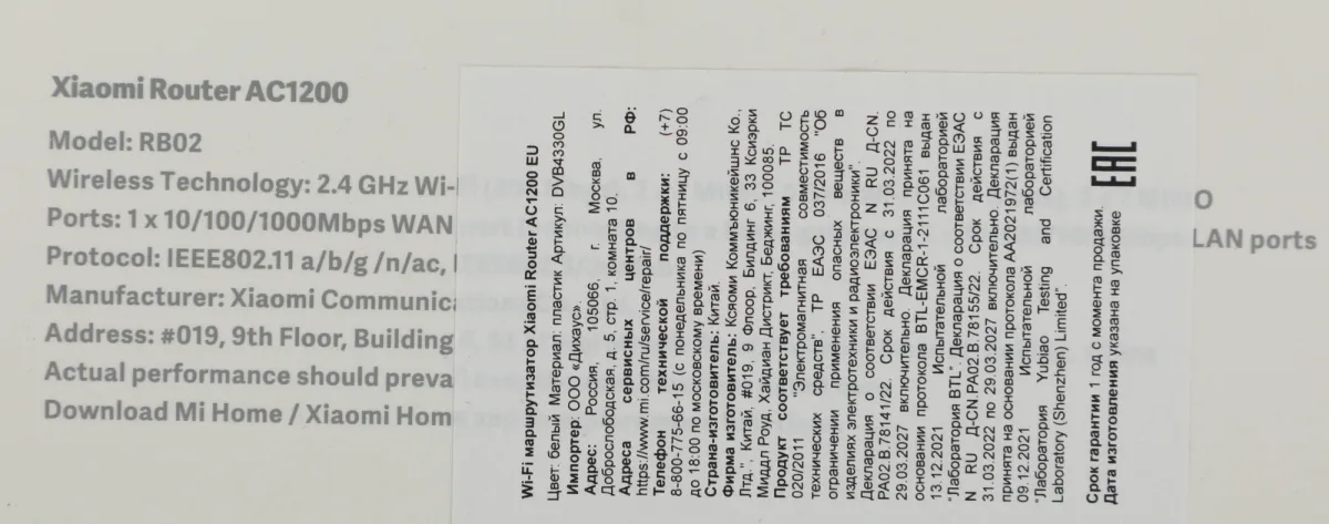 Маршрутизатор Xiaomi Router AC1200 EU (DVB4330GL) AC1200 10/100/1000BASE-TX белый