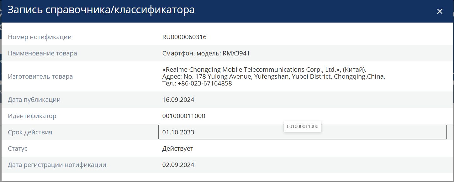 | Смартфон Realme RMX3941 C75 128Gb 8Gb черный моноблок 3G 4G 2Sim 6.72" 1080x2400 Android 14 50Mpix 802.11 a/b/g/n/ac NFC GPS GSM900/1800 GSM1900 TouchSc microSD | Д RU ..СМРИ15073 | 15.12.2024 | 08.12.2029 |