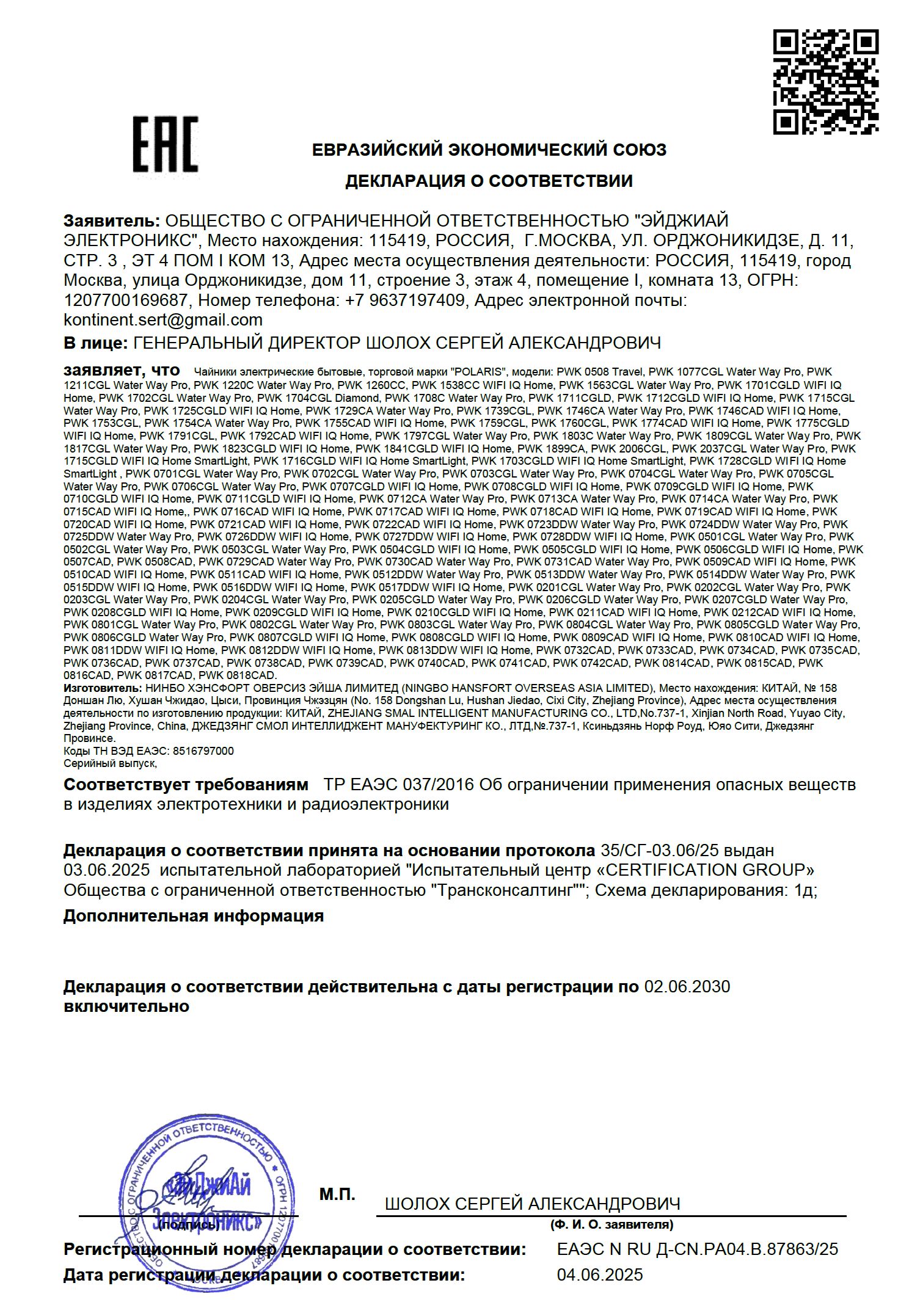 | Чайник электрический Polaris PWK 1712CGLD WIFI IQ Home 1.5л. 2150Вт черный корпус: стекло/пластик (PWK 1712CGLD) | ЕАЭС N RU Д-CN.РА04.В.87863/25 | 03.06.2025 | 01.06.2030 |