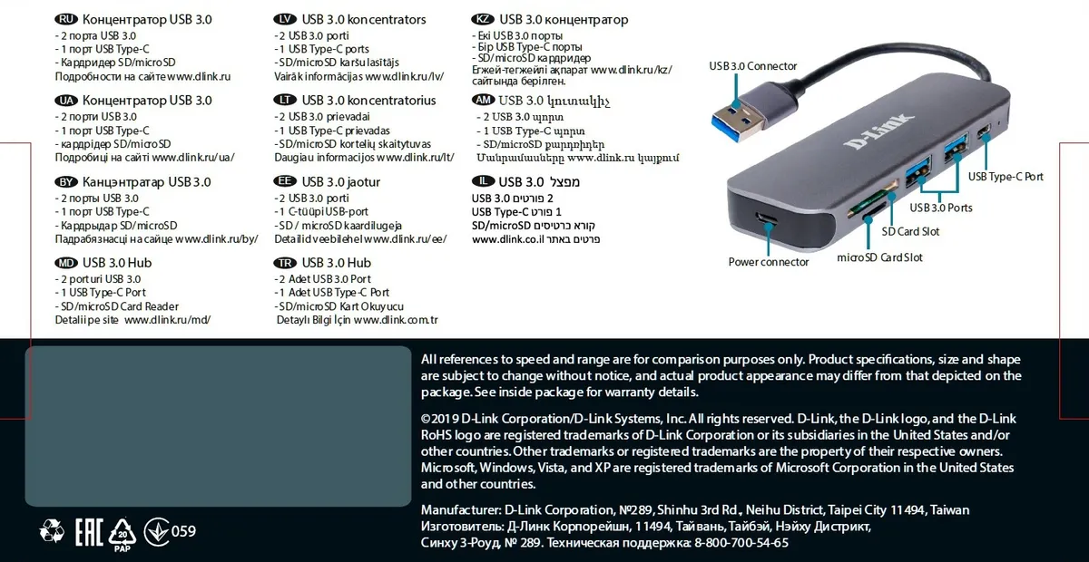 Концентратор USB D-Link DUB-1325/A1A, 2-port USB 3.0, USB Type-C port, SD and (DUB-1325/A1A)
