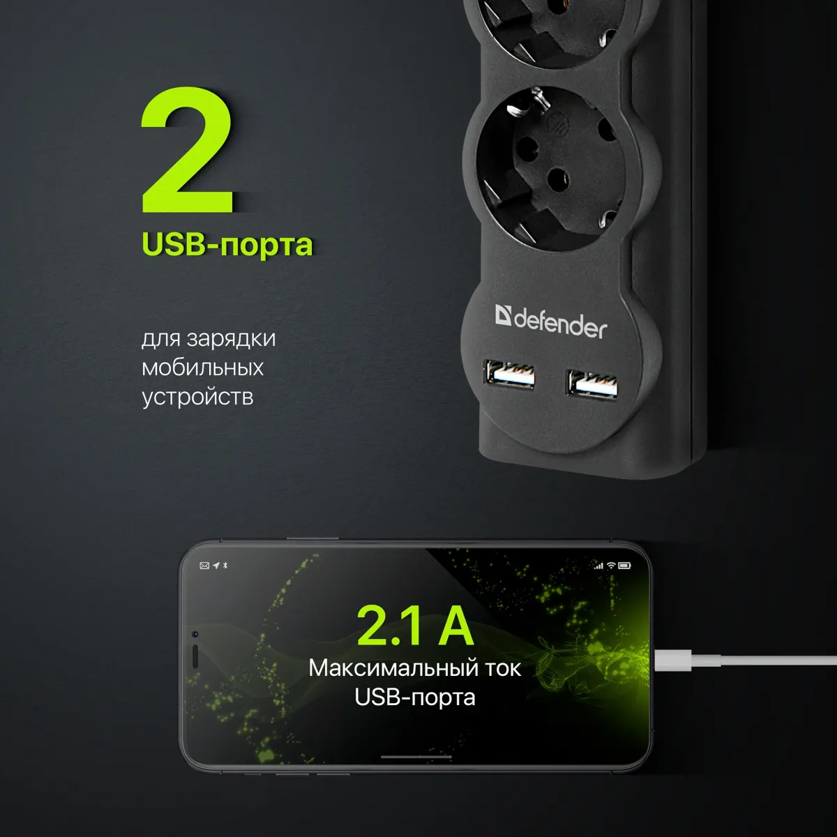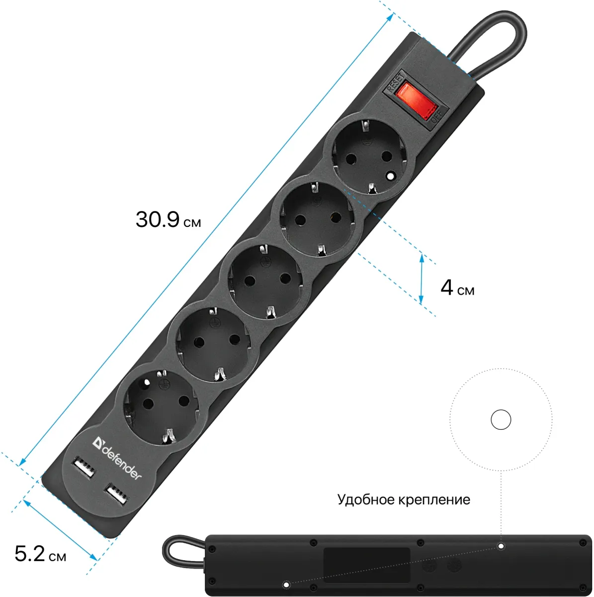 5 розеток с заземлением. Автоматический предохранитель, встроенный в выключатель. 2 USB-порта для зарядки устройств. Защита от перегрузки и короткого замыкания. Крепление на стену. Корпус из негорючего пластика. -