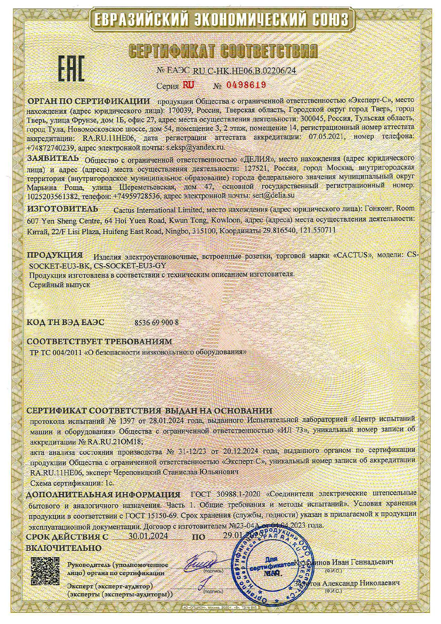 | Розетка Cactus CS-SOCKET-EU3-BK для столешницы 26.5x11.8x6.5см черный | ЕАЭС RU С-HK.НЕ06.В.02206/24 | 29.01.2024 | 28.01.2029 |