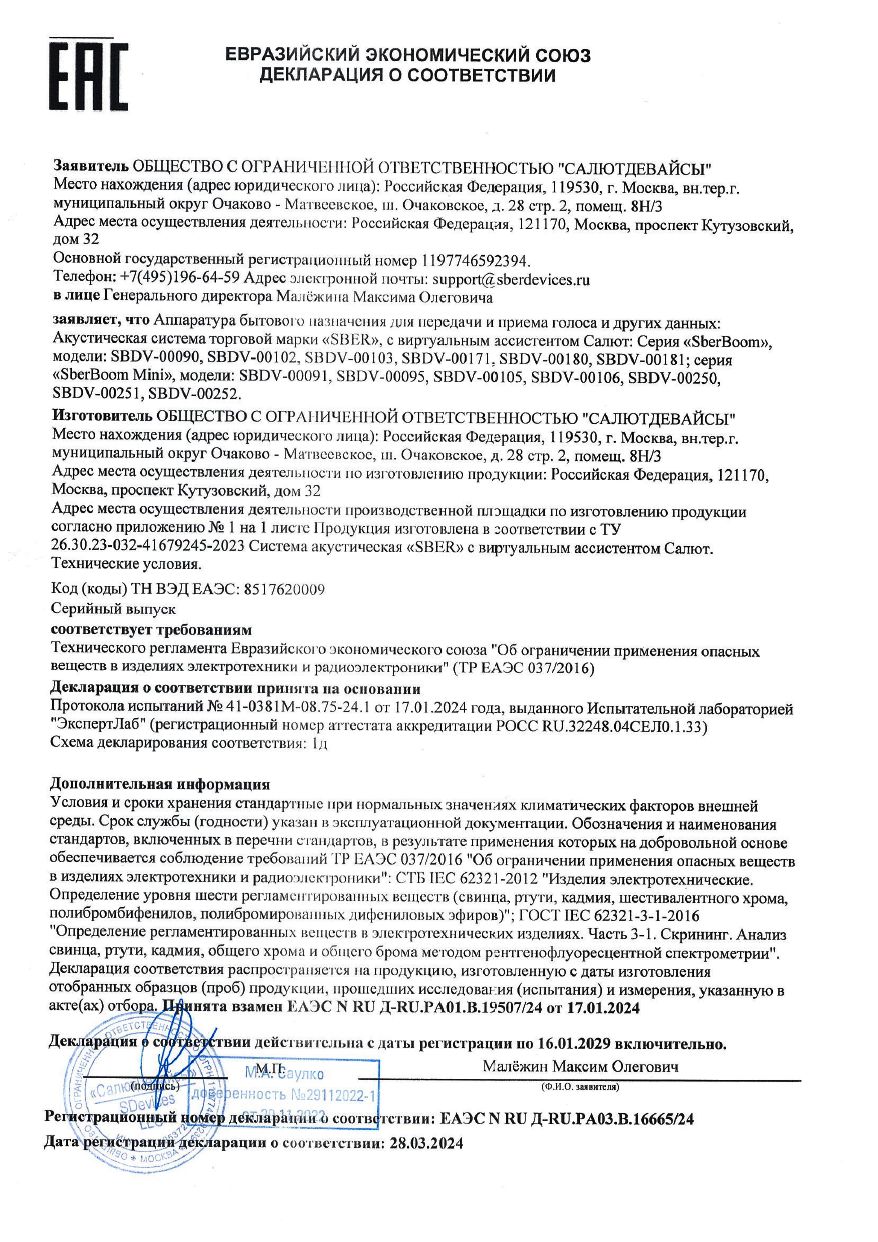| Умная колонка Sber Boom SBDV-00090 Салют синий 40W 1.0 BT/Wi-Fi (SBDV-00090B) | ЕАЭС N RU Д-RU.РА03.В.1666/24 | 27.03.2024 | 15.01.2029 |