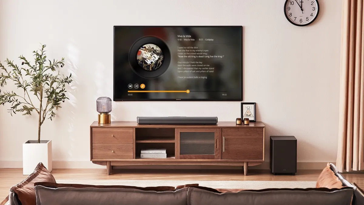 В комплекте: пульт управления, крепление на стену, 2 силовых кабеля, адаптер питания, кабель 4К HD HDMI, кабель 3.5мм-RCA, оптоволоконный кабель, 5 шурупов, 5 дюбелей, 2 крючка, инструкция пользователя -