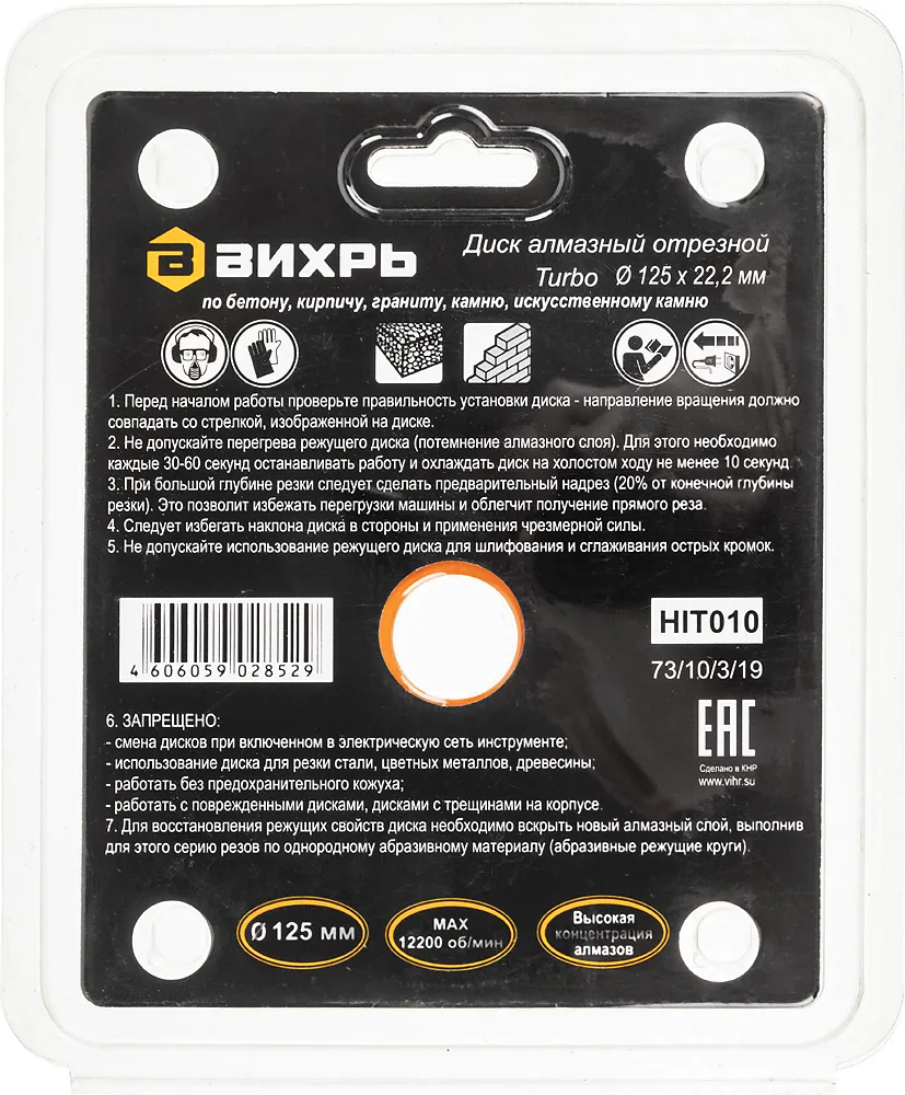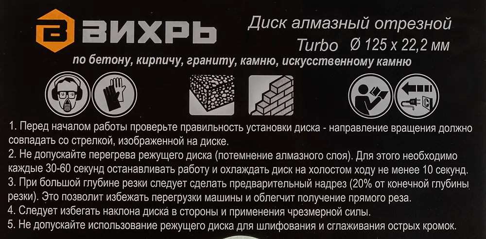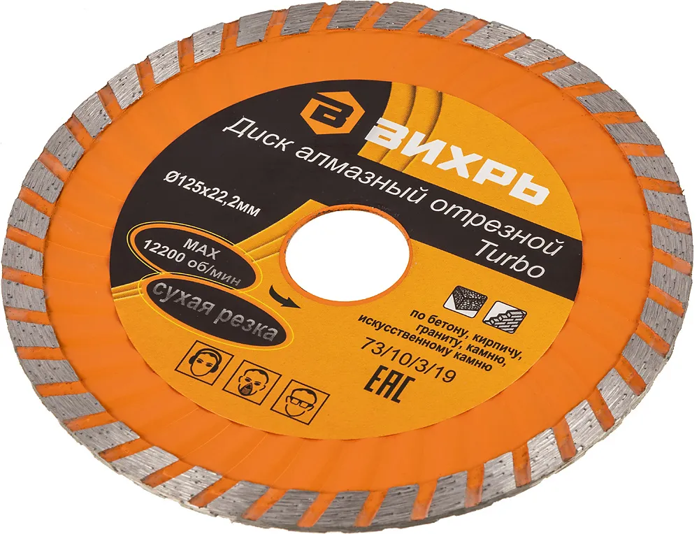Диск алмазный отрезной Турбо 125 х 22,2 мм, сухая резка Вихрь - это алмазный отрезной диск, который используется совместно с угловыми шлифмашинами (болгарками) для сухой резки гранитных, бетонных, кирпичных и каменных изделий. -