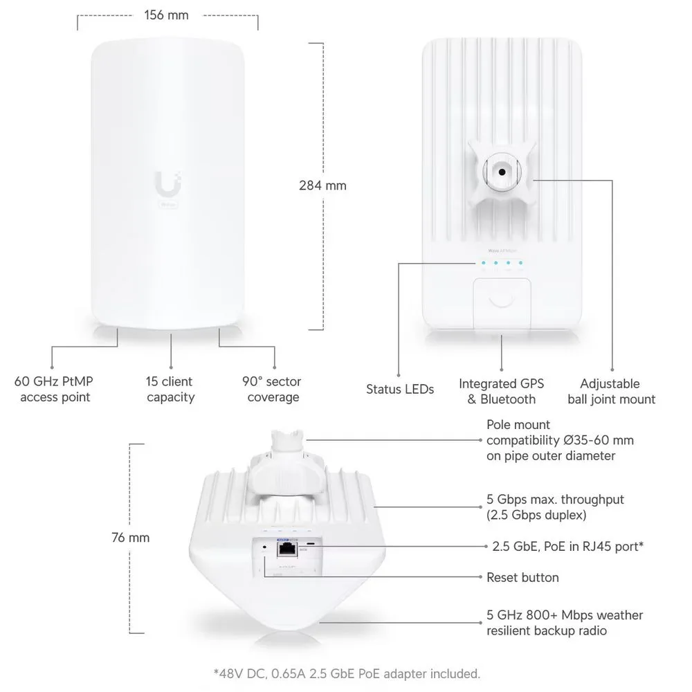 Широкополосная 60 ГГц т/доступа для PtMP до 4км (с Wave Nano)/до 6км (с Wave Long Range). Антенна 20dBi. Пропускная способность - 2.5Gbps. Резервный модуль 5ГГц(802.11ax/13.5dBi). GPS. IPx6 -