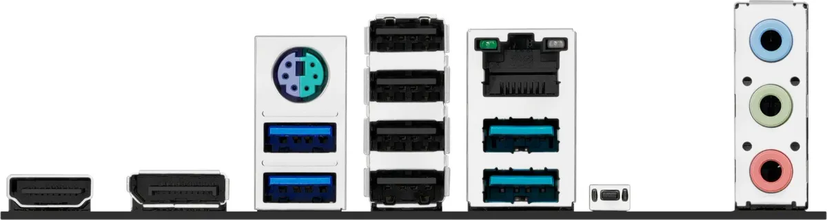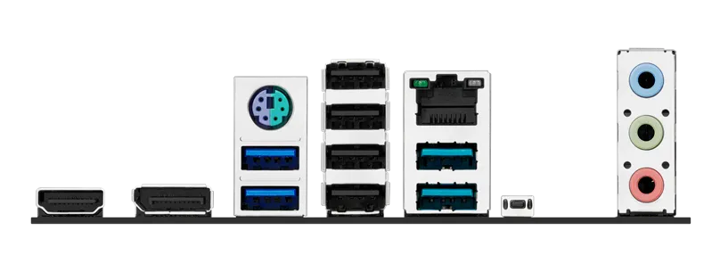 2xUSB Type-A 10 Гб/с, 2xUSB Type-A 5 Гб/с, 4xUSB 2.0 Type-A, DisplayPort, HDMI, 1xRealtek 2.5Gb, 3xAudio jacks, 1xPS/2 Клавиатура/Мышь -