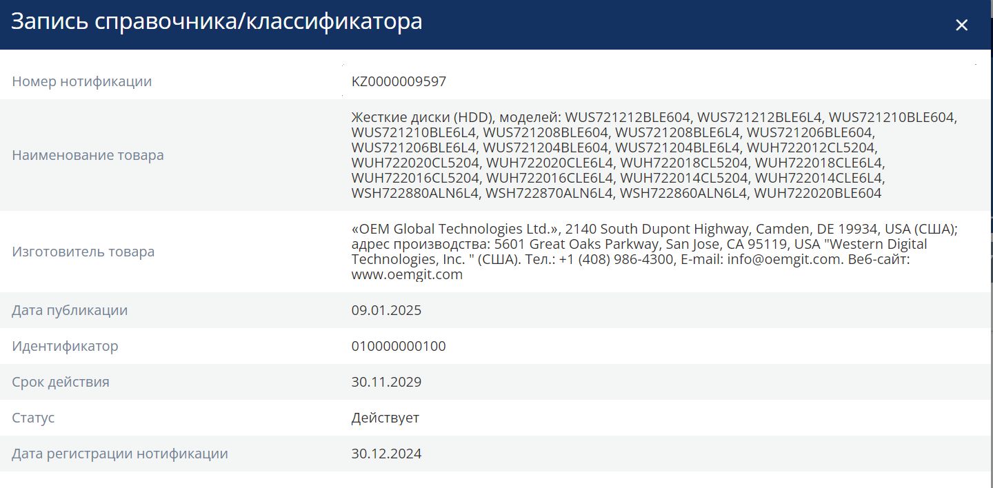 | Жесткий диск WD SATA-III 8TB WUS721208BLE604 Ultrastar DC HC340 512E (7200rpm) 256Mb 3.5" | НИП KZ .ФСБ.0000009597 | 29.12.2024 | 29.11.2029 |