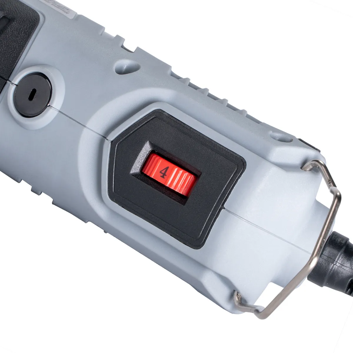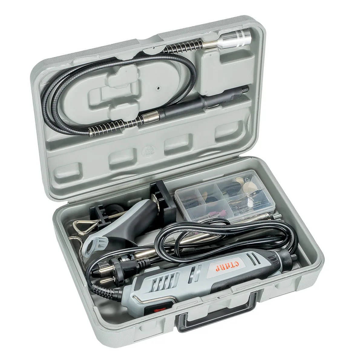 Дополнительный упор для комфортного удержания инстурмента. Быстрая замена угольных щеток. Опорная штанга с креплением, гибкий вал. Эргономичная рукоятка. Плавная регулировка оборотов. Насадки, ключ и дополнительная цанга в комплекте. Пластиковый кейс. -