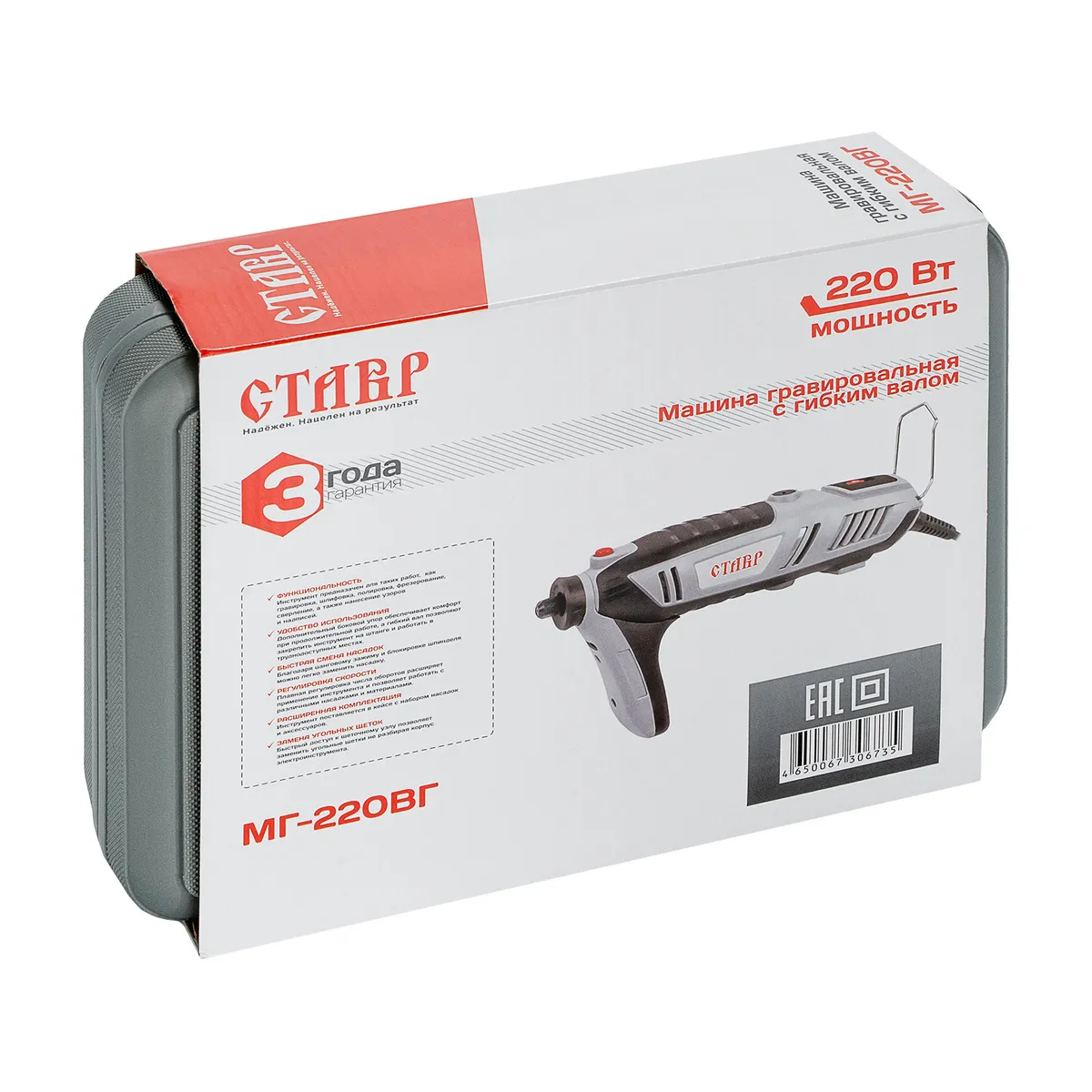 Машина гравировальная СТАВР МГ-220ВГ с гибким валом для работ по гравировке, шлифовке, полировке, фрезерованию, сверлению, нанесению узоров по различным материалам. Поставляется в пластиковом кейсе с гибким валом и набором насадок и принадлежностей. -