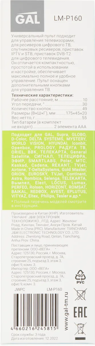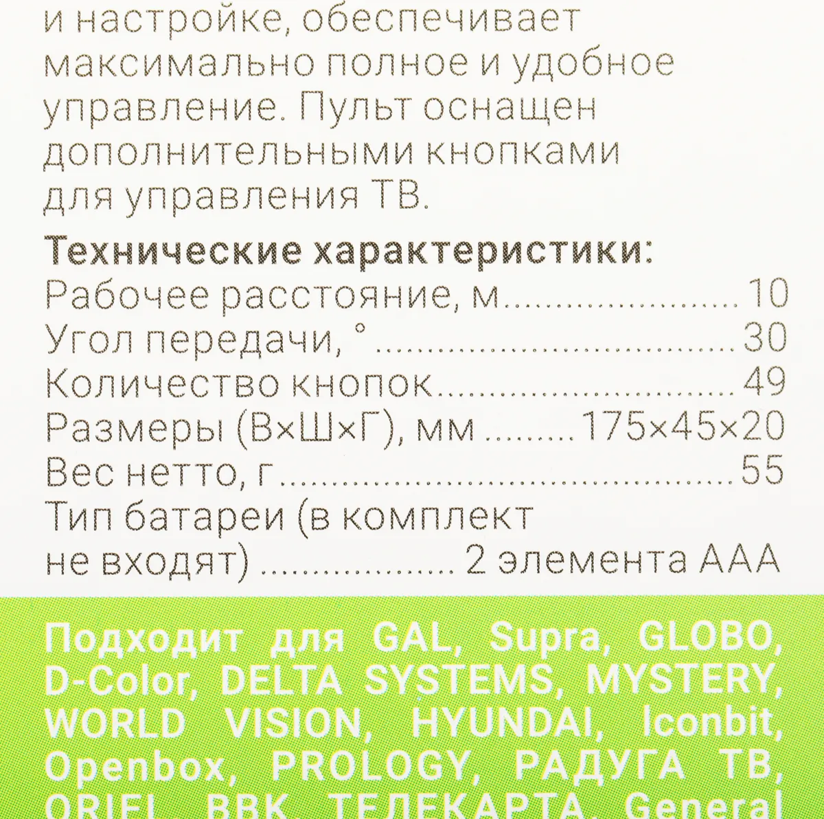 Пульт предназначен для замены вышедшего из строя или утраченного штатного пульта. Он подходит для большинства ресиверов цифрового ТВ, а также некоторых моделей спутниковых ресиверов, приставок IPTV и STB, распространённых на территории России и в странах -