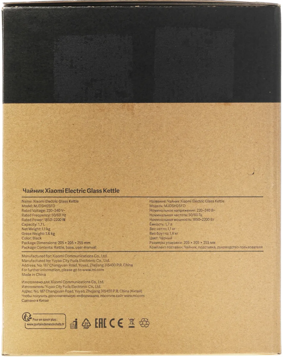 Чайник электрический Xiaomi Electric Glass Kettle RU 1.7л. 2200Вт прозрачный/черный корпус: стекло/пластик (BHR7490RU)