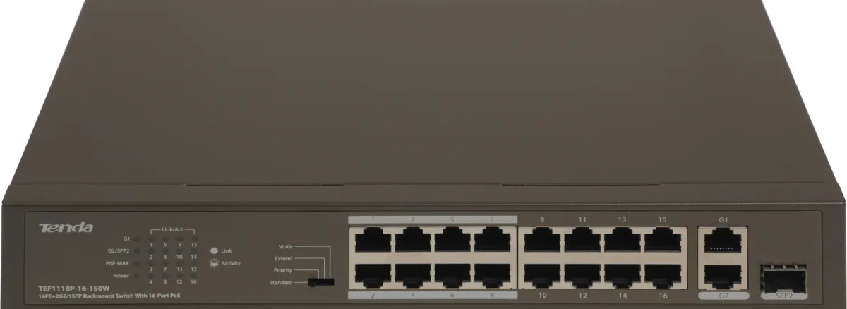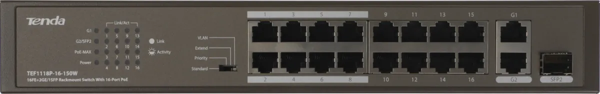 Коммутатор Tenda TEF1118P-16-150W (L2) 16x100Мбит/с 2x1Гбит/с 1SFP 16PoE 130W неуправляемый (TEF1118P-16-150W)