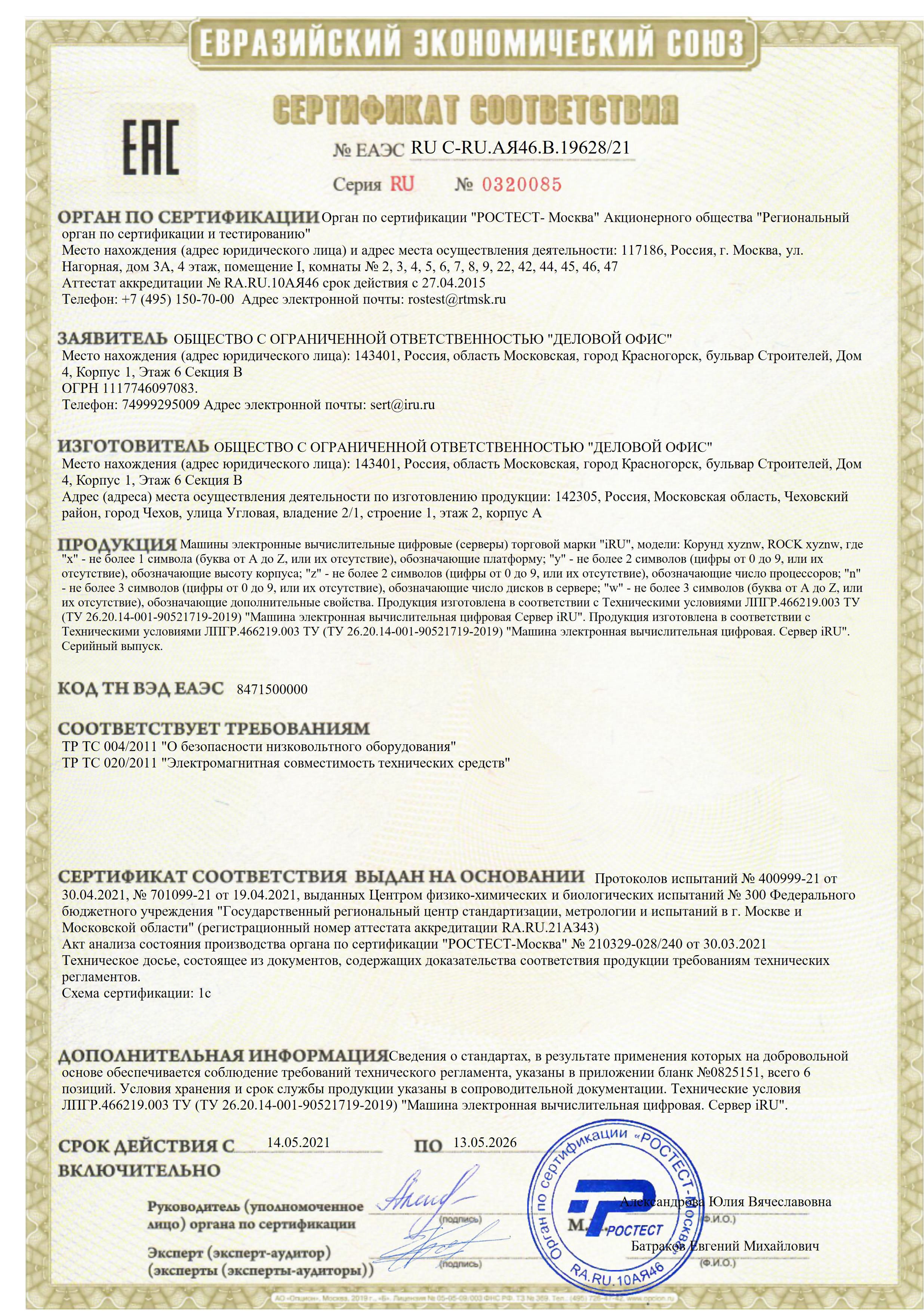 | Сервер IRU Rock A9103E 1xE-2336 2x16Gb 2x960Gb SSD SATA 1x550W w/o OS (2087844) | ЕАЭС RU С-RU.АЯ46.В.19628/21 | 13.05.2021 | 12.05.2026 |
