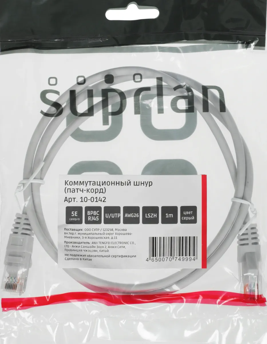 Патч-корд Suprlan 10-0142 UTP RJ-45 вил.-вилка RJ-45 кат.5E 1м серый LSZH 26AWG (10-0142)