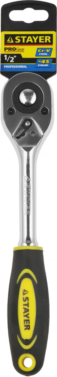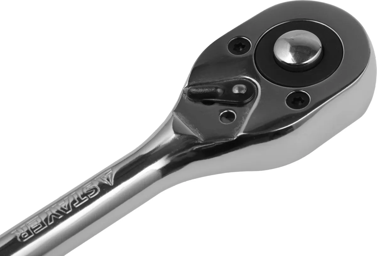 Трещотка 1/2" для торцовых головок STAYER - удобный и надежный инструмент. Эргономичные ручки трещоток удобно лежат в руке и обеспечивают надежный захват. Корпус и трещоточный механизм выполнены из хромованадиевой стали. Функция сброса позволяет быстро ме -