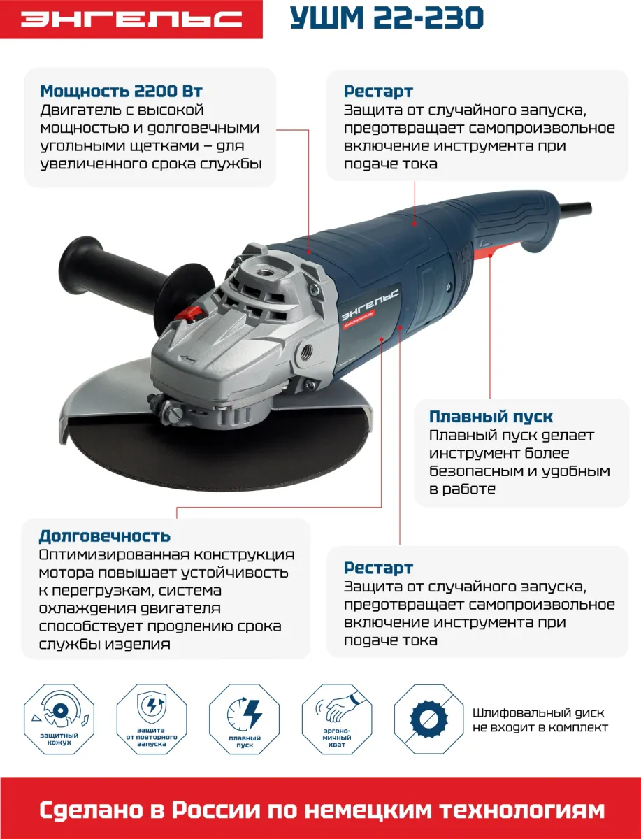 Углошлифовальная машина Энгельс УШМ 22-230 2200Вт 6600об/мин рез.шпин.:M14 d=230мм (0.701.030.021) (0.701.030.021)