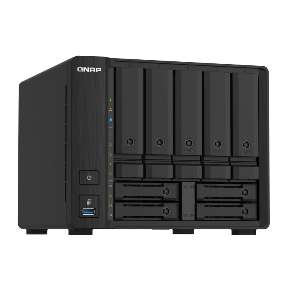 Flash-память 512MB. 5 слотов для накопителей 3.5"/2.5" (до 18TB каждый) и 4x для 2.5" (до 4TB). 2 порта RJ45 2.5G и 2 порта SFP+. Синхронизация файлов между несколькими устр-ми. Выборочная синхронизация -