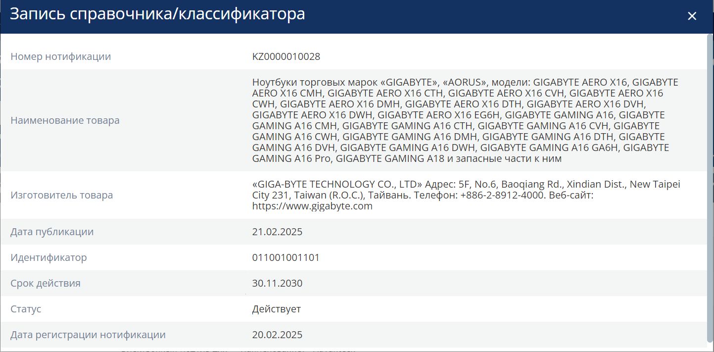 | Ноутбук Gigabyte GAMING A16 Core i7 13620H 32Gb SSD1Tb NVIDIA GeForce RTX5050 8Gb 16" IPS QHD+ (2560x1600) FreeDOS grey WiFi BT Cam | НИП KZ .ФСБ.0000010028 | 19.02.2025 | 29.11.2030 |