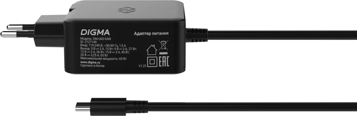 | Блок питания Digma DM-U65-GAN автоматический 65W 5V-20V 3A от бытовой электросети | ЕАЭС RU С-CN.АЯ46.В.43209/25 | 24.09.2025 | 23.09.2030 |